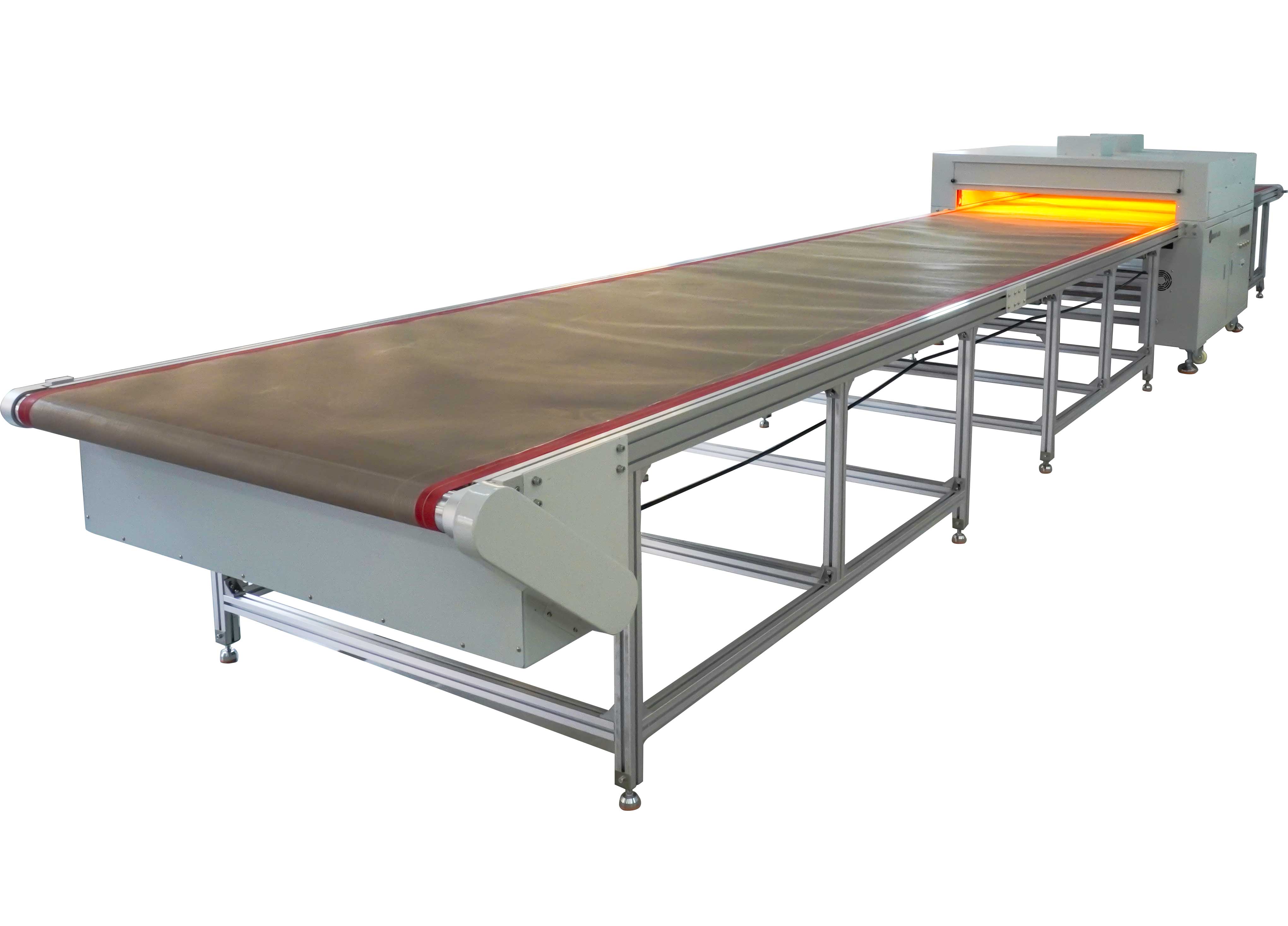 2、輸送帶采用耐高溫特氟龍網(wǎng)帶,具有自動(dòng)糾偏功能。