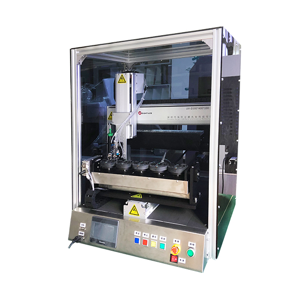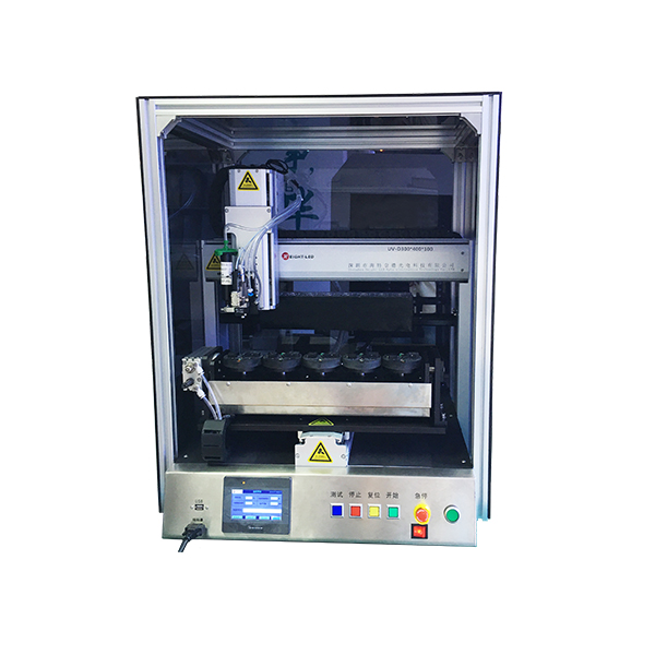 This is a high-performance automatic dispensing and curing all-in-one machine with built-in UVLED curing light source, which is on and off, does not contain mercury, and does not generate ozone. It has the characteristics of safety and environmental protection, low heat generation, super power saving, and long life. The size and fixture of the light source can be customized according to the customer\'s product.